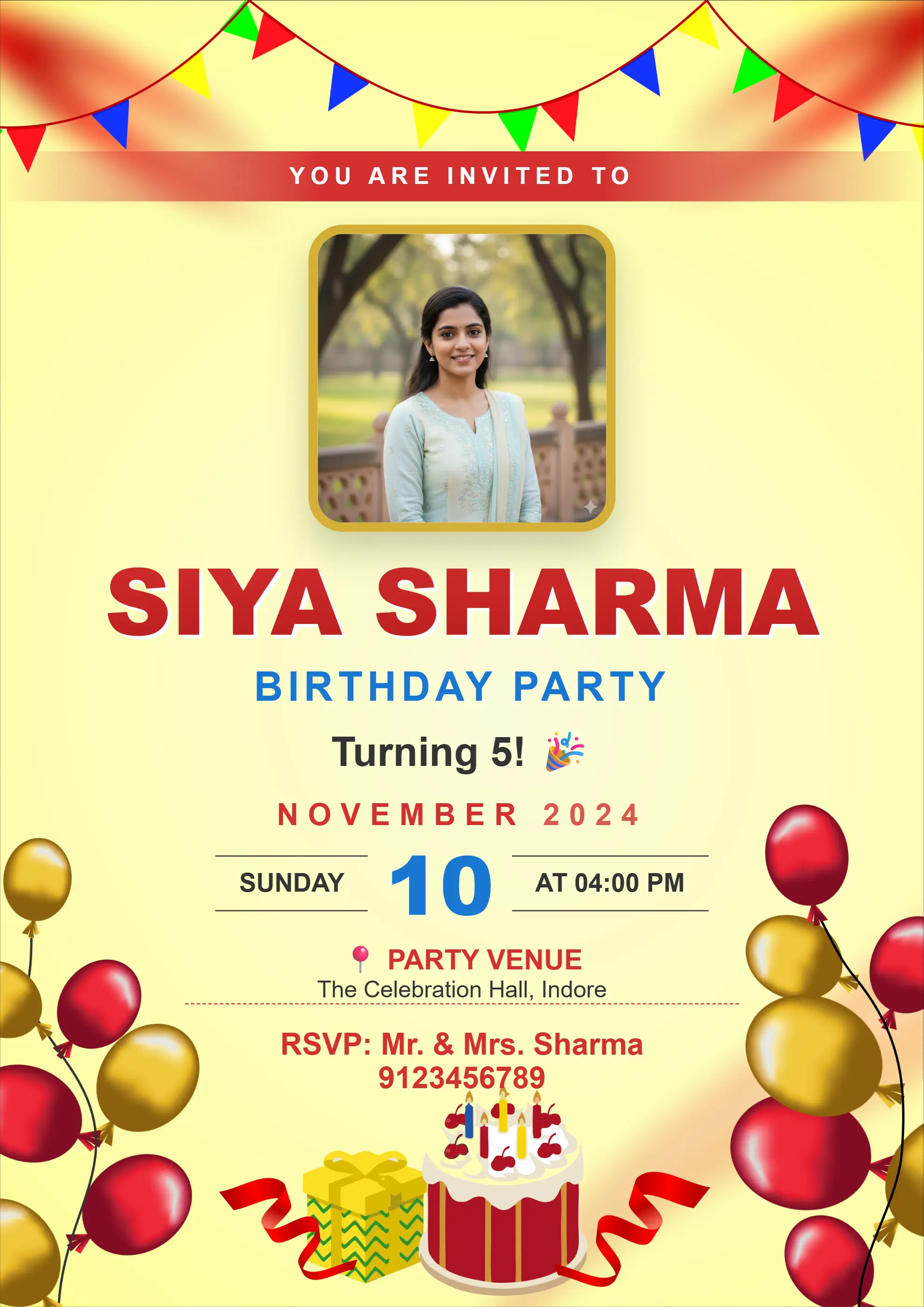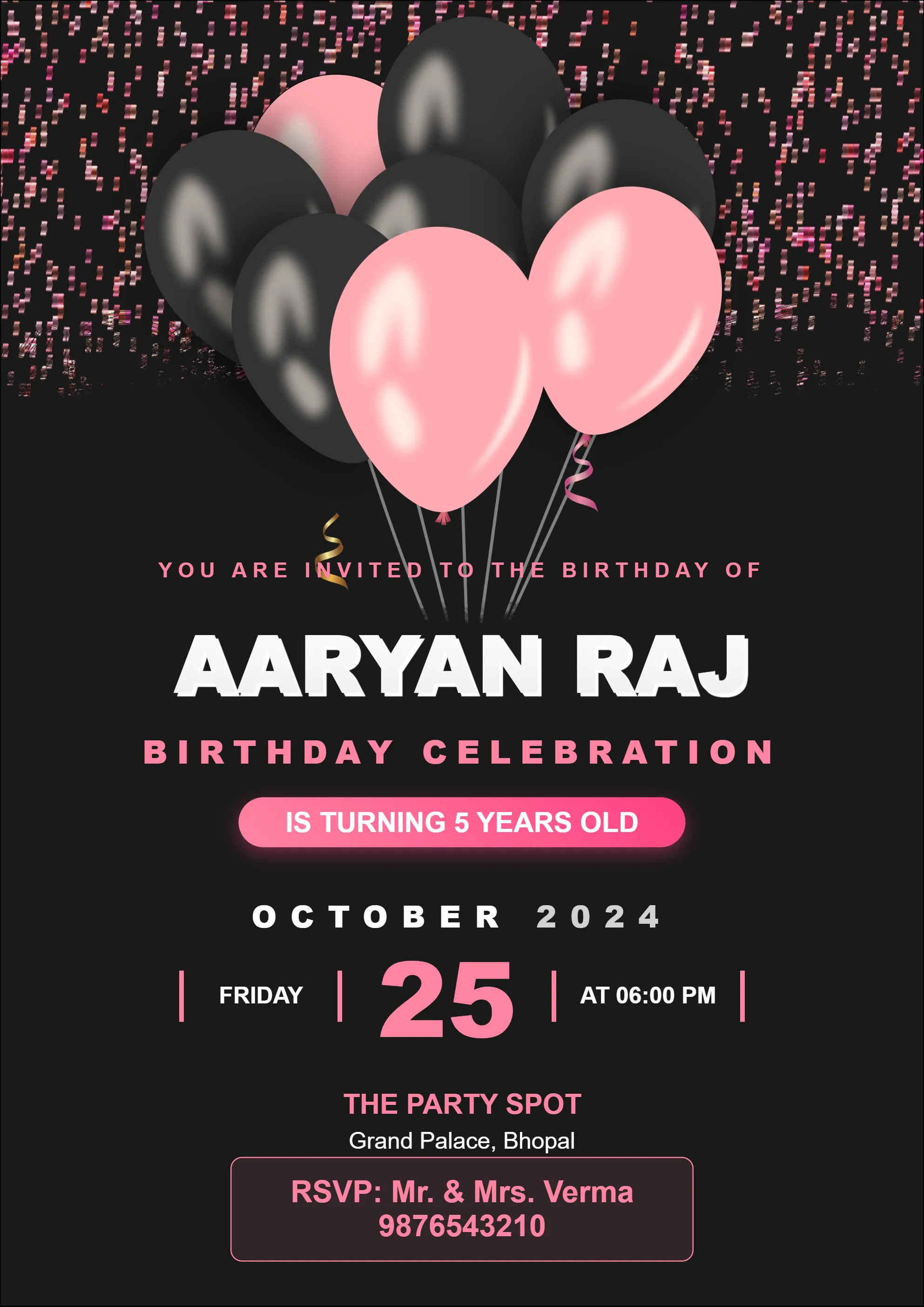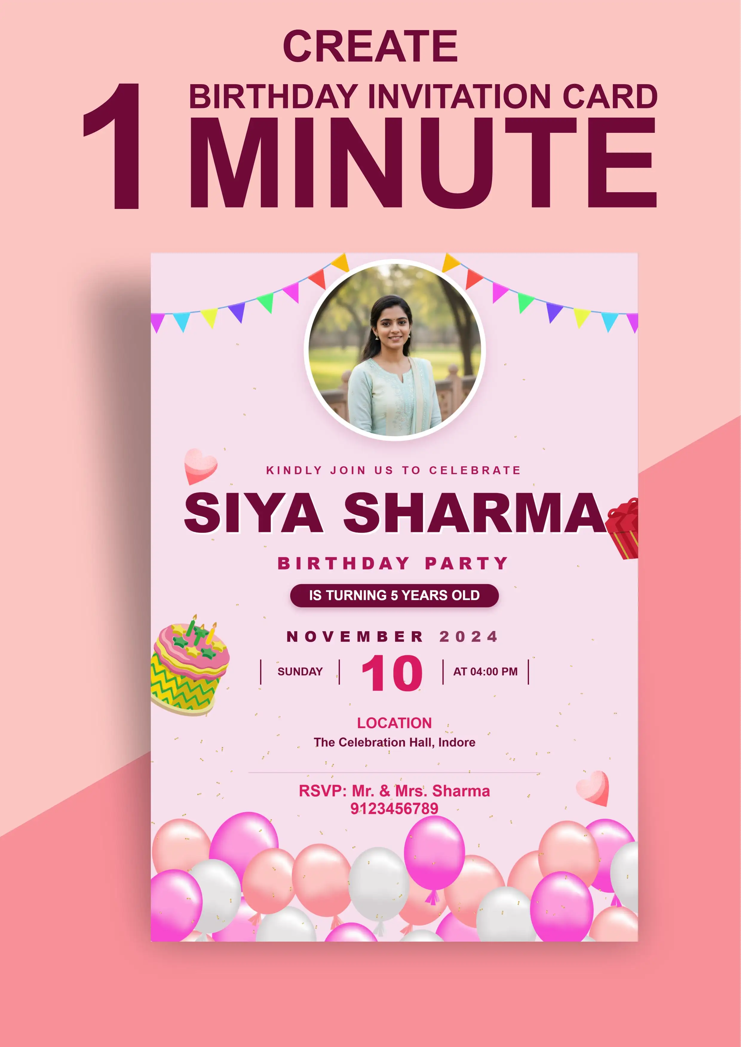 Our easy-to-use editor allows you to create professional birthday invitation cards in just minutes. Follow the guide below to understand what details you can customize.